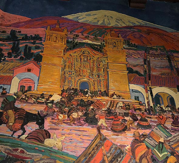 En el interior, el protagonismo lo tiene el mural realizado por Alfredo Guido, pintado entre 1925 y 1927 junto a su equipo. La obra, montada sobre tela y luego adherida a las paredes, despliega una secuencia de escenas del mundo andino —como el Lago Titicaca, celebraciones populares y paisajes culturales— que dialogan con la arquitectura del lugar. Este mural, considerado por especialistas como una pieza de gran potencia expresiva, sintetiza el espíritu de la casa: la fusión entre arte, identidad y territorio.