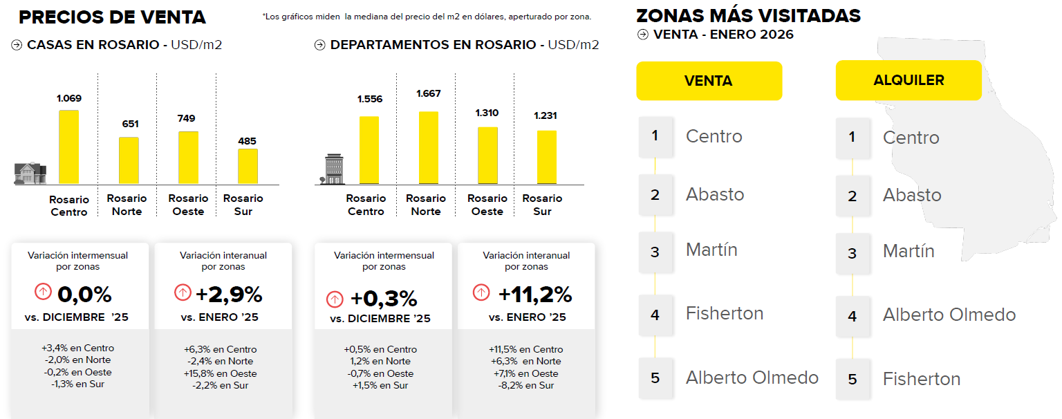 El interés de los usuarios también muestra un patrón definido. En enero de 2026, el Centro se mantiene como la zona más visitada tanto para venta como para alquiler. En el ranking de búsquedas para venta le siguen Abasto, Martín, Fisherton y Alberto Olmedo, mientras que para alquiler el orden es Centro, Abasto, Martín, Alberto Olmedo y Fisherton.