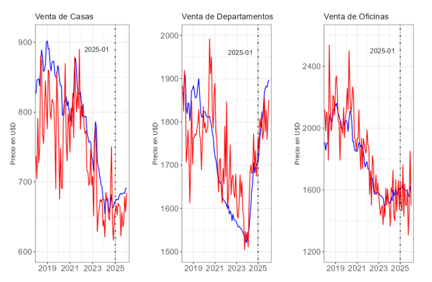 En términos intermensuales, los precios de venta en dólares por metro cuadrado mostraron movimientos moderados. Las casas no registraron variaciones (0,0%), mientras que los departamentos subieron 0,3% y las oficinas retrocedieron 1,8% respecto de diciembre de 2025.