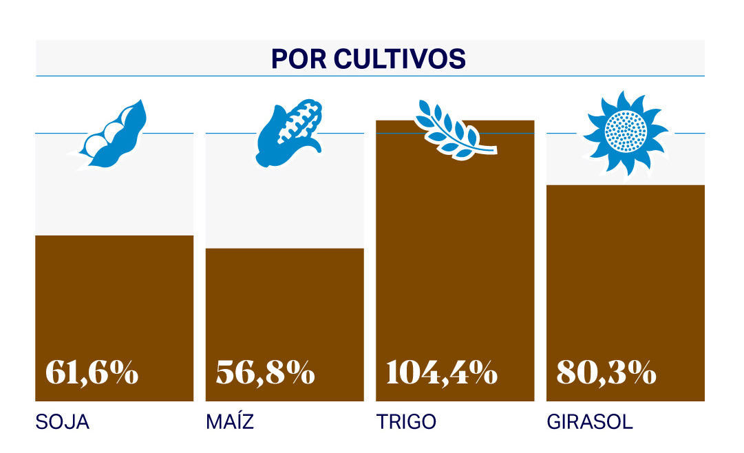 En soja, el Estado participa con el 61,6% de la renta, mientras que en maíz el indicador alcanza el 56,8%. En girasol, el porcentaje trepa al 80,3%, reflejando una situación más complicada.