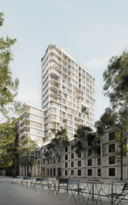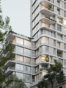 El edificio se destaca por su enfoque altamente contextualista, un sello que define esta propuesta: es una torre diseñada para integrarse de manera precisa con las tipologías existentes del entorno, evitando rupturas morfológicas y preservando la escala barrial. Según explicó Matías Imbern, CEO y Director de Diseño, se trata del “único edificio que no tiene medianeras; se adhiere a sus vecinos como una ventosa”, logrando continuidad volumétrica con el patrimonio cercano y replicando patios, alturas y proporciones para asegurar una correcta convivencia urbana.