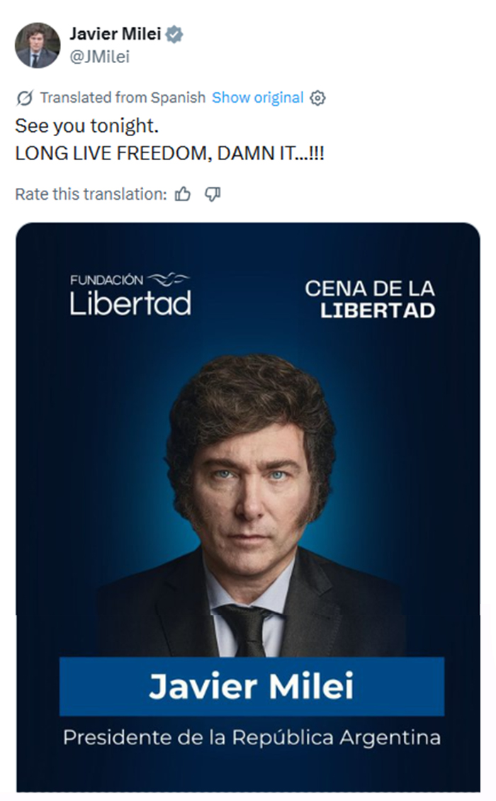 El presidente Javier Milei confirmó este lunes que participará de la cena anual de la Fundación Libertad al publicar en su cuenta de X un mensaje directo: “Nos vemos hoy a la noche… ‘Viva la libertad, carajo’”.