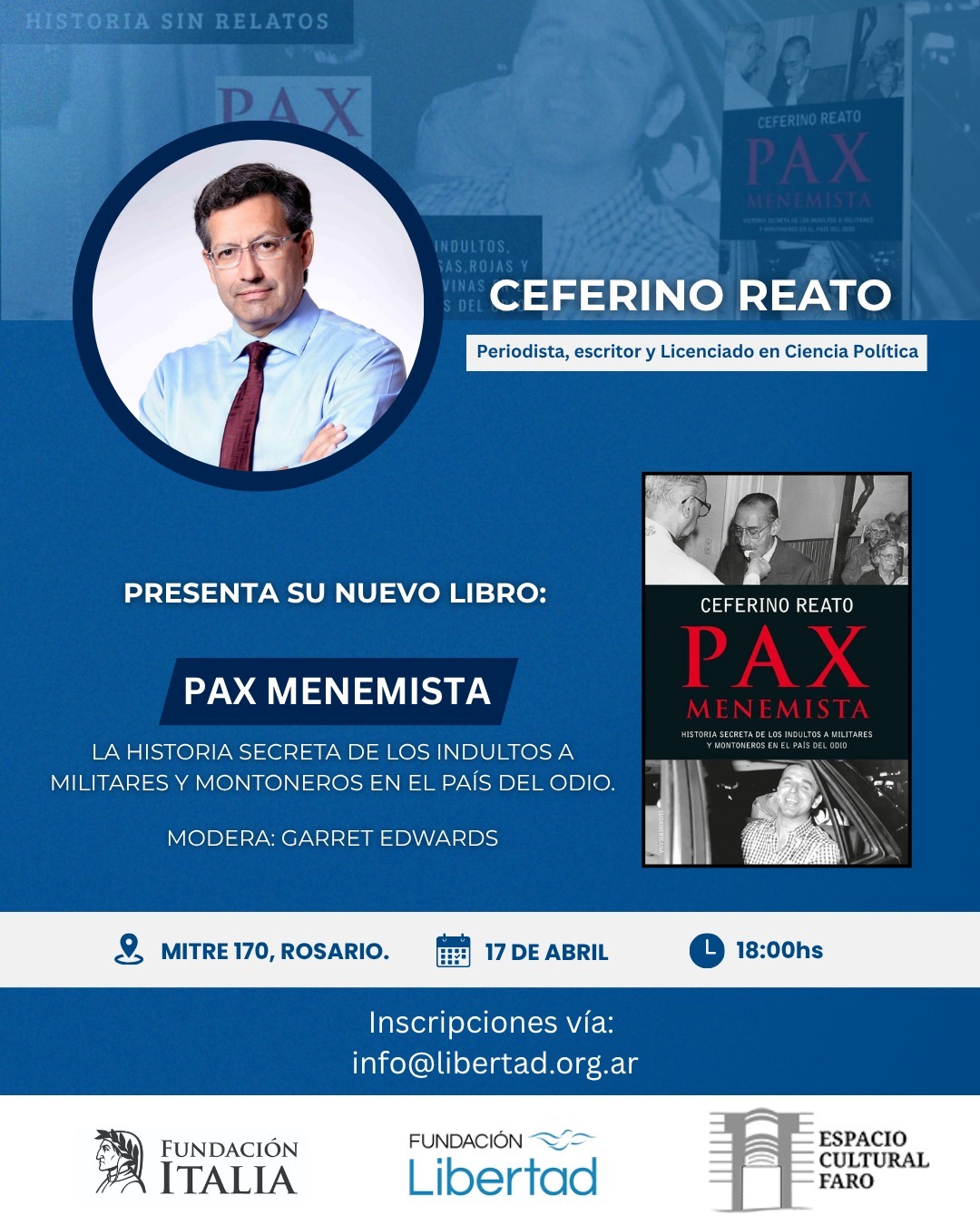 Este viernes 17 de abril a las 18, la Fundación Libertad será escenario de la presentación de Pax Menemista, el más reciente trabajo del periodista y escritor Ceferino Reato. La actividad se desarrollará en Mitre 170, en Rosario, con entrada gratuita previa inscripción.